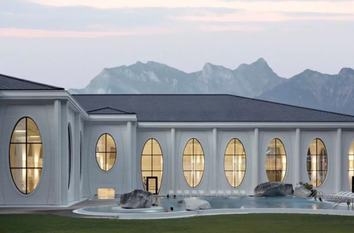 溫泉浴場(chǎng)屬于大酒店的一部分,因此文化和審美具有傳統(tǒng)上的同一性:放松,親和。建筑非常具象,就是一個(gè)地道的建筑物,內(nèi)部用涂成白色的木材替代“城市”中的石柱子。同時(shí)建筑顯眼的橢圓形窗口讓景觀(guān)更優(yōu)縱深感,并充滿(mǎn)了維多利亞時(shí)代感,這算是對(duì)環(huán)境景觀(guān)應(yīng)對(duì)的一個(gè)中立性態(tài)度。