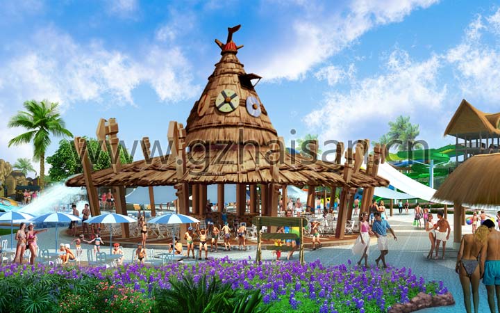 水上樂園設(shè)計以企鵝的馬達加斯加探險之旅為主題,在設(shè)計上注重攝取雨林地理風(fēng)貌、人文風(fēng)情、建筑藝術(shù)、生態(tài)景觀等鮮明的主題元素,建筑設(shè)計充分吸收雨林文化和海洋文化的元素,讓游客恍若置身于激烈的非洲熱帶雨林度假氛圍中,使情景體驗與度假休閑有機結(jié)合與有效實現(xiàn),營造熱帶風(fēng)情水上休閑世界。